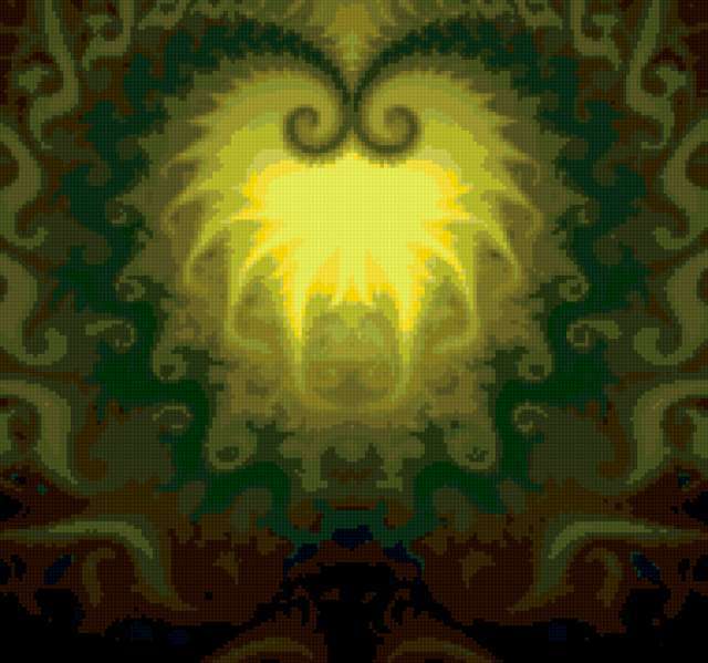 Ориентировочно так, схема вышивки «Arabesque», созданная автором me4o, будет выглядеть при отшиве на канве. Размер данной вышивки равен 190x178 крестов, при этом используется 23 цветов. Ключевые слова, по которым можно найти эту схему: arabesque, abstract, yellow, green. Также, вы можете взглянуть на оригинальную картинку, соответствующую данной схеме вышивки.