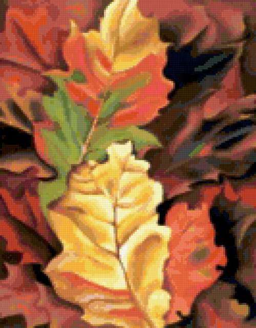 Ориентировочно так, схема вышивки «Autumn leaves», созданная автором iborissova, будет выглядеть при отшиве на канве. Размер данной вышивки равен 133x170 крестов, при этом используется 61 цветов. Ключевые слова, по которым можно найти эту схему: autumn. Также, вы можете взглянуть на оригинальную картинку, соответствующую данной схеме вышивки.