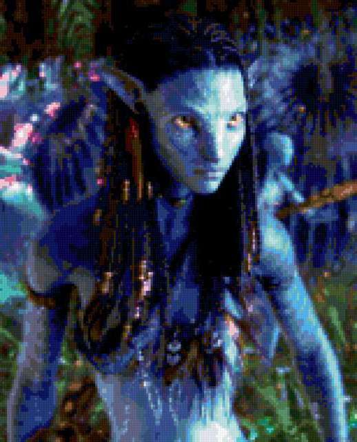 Ориентировочно так, схема вышивки «Avatar», созданная автором aniela, будет выглядеть при отшиве на канве. Размер данной вышивки равен 154x190 крестов, при этом используется 66 цветов. Ключевые слова, по которым можно найти эту схему: фэнтези, avatar. Также, вы можете взглянуть на оригинальную картинку, соответствующую данной схеме вышивки.