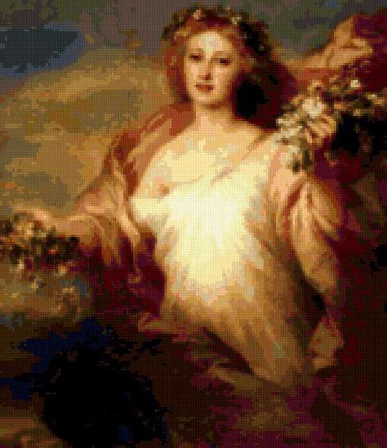 Ориентировочно так, схема вышивки «Avrora», созданная автором lukrecija12, будет выглядеть при отшиве на канве. Размер данной вышивки равен 160x185 крестов, при этом используется 48 цветов. Ключевые слова, по которым можно найти эту схему: zenshina, boginia. Также, вы можете взглянуть на оригинальную картинку, соответствующую данной схеме вышивки.