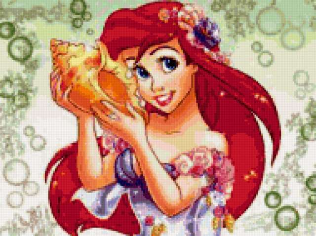 Ориентировочно так, схема вышивки «BELLE ARIEL», созданная автором xrestheitz, будет выглядеть при отшиве на канве. Размер данной вышивки равен 190x142 крестов, при этом используется 77 цветов. Ключевые слова, по которым можно найти эту схему: DISNEY. Также, вы можете взглянуть на оригинальную картинку, соответствующую данной схеме вышивки.
