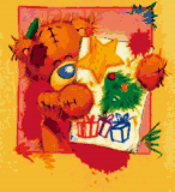 Ориентировочно так, схема вышивки «Bear Teddy», созданная автором Cherry_LudOk, будет выглядеть при отшиве на канве. Размер данной вышивки равен 146x160 крестов, при этом используется 60 цветов. Ключевые слова, по которым можно найти эту схему: мишка тедди. Также, вы можете взглянуть на оригинальную картинку, соответствующую данной схеме вышивки.