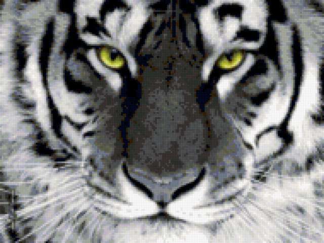 Ориентировочно так, схема вышивки «Bely tigr», созданная автором sevarochka, будет выглядеть при отшиве на канве. Размер данной вышивки равен 190x143 крестов, при этом используется 58 цветов. Ключевые слова, по которым можно найти эту схему: tiger. Также, вы можете взглянуть на оригинальную картинку, соответствующую данной схеме вышивки.