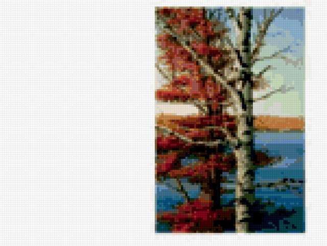 Ориентировочно так, схема вышивки «Berioza», созданная автором ekako, будет выглядеть при отшиве на канве. Размер данной вышивки равен 150x113 крестов, при этом используется 49 цветов. К несчастью, автор не назначил для схемы ключевые слова. Также, вы можете взглянуть на оригинальную картинку, соответствующую данной схеме вышивки.