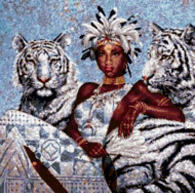 Ориентировочно так, схема вышивки «Big Cats», созданная автором aniela, будет выглядеть при отшиве на канве. Размер данной вышивки равен 190x188 крестов, при этом используется 75 цветов. Ключевые слова, по которым можно найти эту схему: Wildlife, animals, Животные, тигр, Белый тигр. Также, вы можете взглянуть на оригинальную картинку, соответствующую данной схеме вышивки.