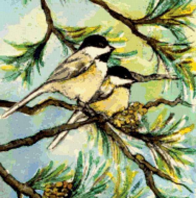 Ориентировочно так, схема вышивки «Birds», созданная автором aniela, будет выглядеть при отшиве на канве. Размер данной вышивки равен 188x190 крестов, при этом используется 82 цветов. Ключевые слова, по которым можно найти эту схему: wildlife, birds, птицы. Также, вы можете взглянуть на оригинальную картинку, соответствующую данной схеме вышивки.