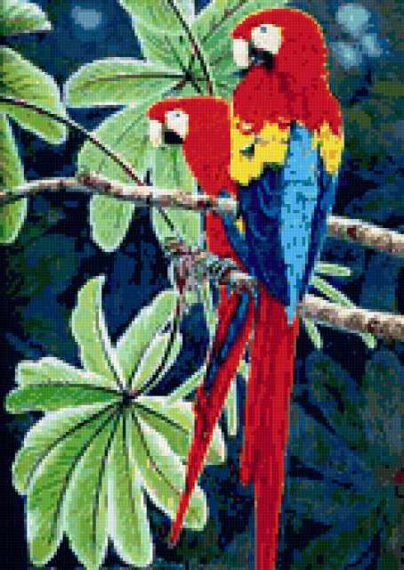 Ориентировочно так, схема вышивки «Birds», созданная автором aniela, будет выглядеть при отшиве на канве. Размер данной вышивки равен 135x190 крестов, при этом используется 71 цветов. Ключевые слова, по которым можно найти эту схему: wildlife, birds, птицы. Также, вы можете взглянуть на оригинальную картинку, соответствующую данной схеме вышивки.