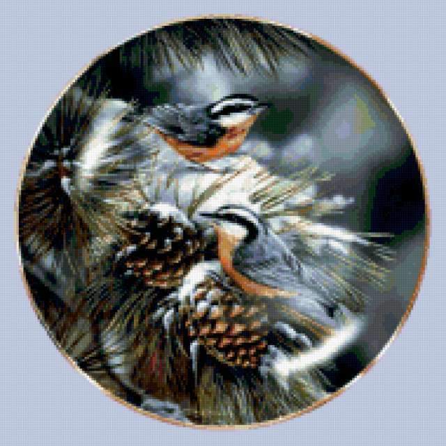 Ориентировочно так, схема вышивки «Birds», созданная автором aniela, будет выглядеть при отшиве на канве. Размер данной вышивки равен 190x190 крестов, при этом используется 72 цветов. Ключевые слова, по которым можно найти эту схему: wildlife, birds, птицы. Также, вы можете взглянуть на оригинальную картинку, соответствующую данной схеме вышивки.