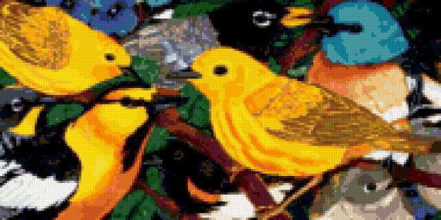 Ориентировочно так, схема вышивки «Birds», созданная автором pandreevska, будет выглядеть при отшиве на канве. Размер данной вышивки равен 190x95 крестов, при этом используется 62 цветов. Ключевые слова, по которым можно найти эту схему: animals, животные, birds. Также, вы можете взглянуть на оригинальную картинку, соответствующую данной схеме вышивки.