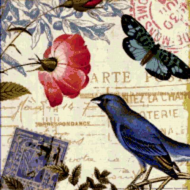 Ориентировочно так, схема вышивки «Birds», созданная автором aniela, будет выглядеть при отшиве на канве. Размер данной вышивки равен 190x190 крестов, при этом используется 79 цветов. Ключевые слова, по которым можно найти эту схему: wildlife, birds, птицы. Также, вы можете взглянуть на оригинальную картинку, соответствующую данной схеме вышивки.
