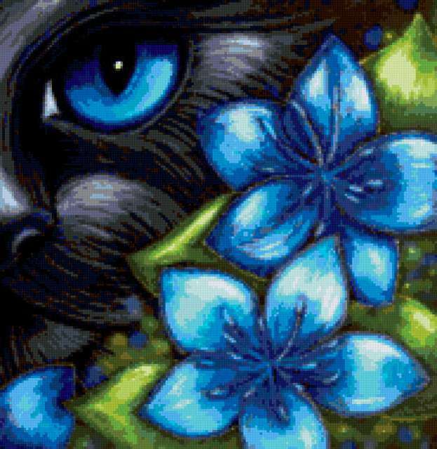 Ориентировочно так, схема вышивки «Black Cat», созданная автором pandreevska, будет выглядеть при отшиве на канве. Размер данной вышивки равен 185x190 крестов, при этом используется 50 цветов. Ключевые слова, по которым можно найти эту схему: animals, животные, magic, black cat, flowers. Также, вы можете взглянуть на оригинальную картинку, соответствующую данной схеме вышивки.