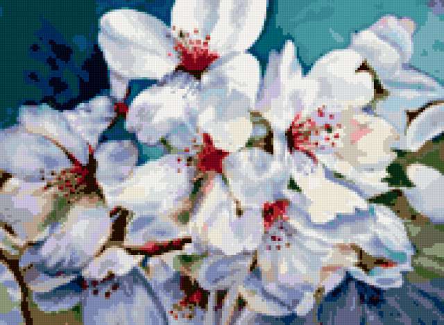 Ориентировочно так, схема вышивки «Blossom», созданная автором lukrecija12, будет выглядеть при отшиве на канве. Размер данной вышивки равен 190x139 крестов, при этом используется 43 цветов. Ключевые слова, по которым можно найти эту схему: cvety. Также, вы можете взглянуть на оригинальную картинку, соответствующую данной схеме вышивки.