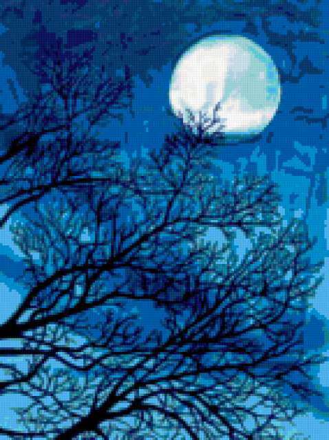 Ориентировочно так, схема вышивки «Blue moon», созданная автором aniela, будет выглядеть при отшиве на канве. Размер данной вышивки равен 142x190 крестов, при этом используется 31 цветов. Ключевые слова, по которым можно найти эту схему: moon, landscape. Также, вы можете взглянуть на оригинальную картинку, соответствующую данной схеме вышивки.