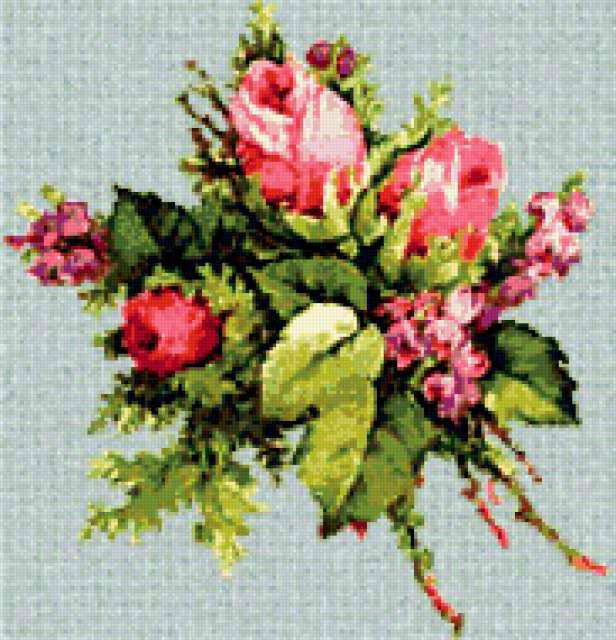 Ориентировочно так, схема вышивки «Bouquet», созданная автором iborissova, будет выглядеть при отшиве на канве. Размер данной вышивки равен 183x190 крестов, при этом используется 77 цветов. Ключевые слова, по которым можно найти эту схему: рози, цветы. Также, вы можете взглянуть на оригинальную картинку, соответствующую данной схеме вышивки.