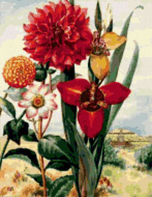 Ориентировочно так, схема вышивки «Bright Flowers», созданная автором pandreevska, будет выглядеть при отшиве на канве. Размер данной вышивки равен 147x190 крестов, при этом используется 59 цветов. Ключевые слова, по которым можно найти эту схему: floral, landscape, bright, colorful, stunning. Также, вы можете взглянуть на оригинальную картинку, соответствующую данной схеме вышивки.