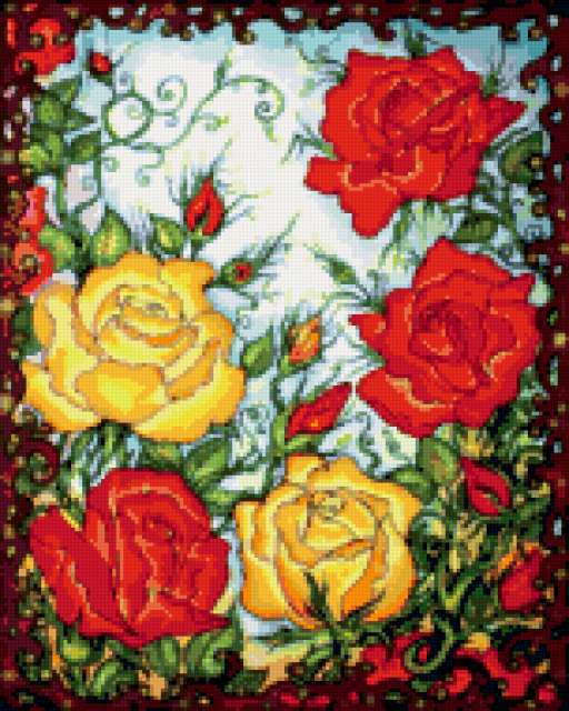 Ориентировочно так, схема вышивки «Bright Flowers», созданная автором pandreevska, будет выглядеть при отшиве на канве. Размер данной вышивки равен 152x190 крестов, при этом используется 61 цветов. Ключевые слова, по которым можно найти эту схему: floral, цветок, bright, colorful, joy . Также, вы можете взглянуть на оригинальную картинку, соответствующую данной схеме вышивки.