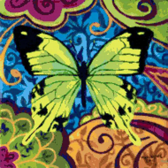 Ориентировочно так, схема вышивки «Butterflies», созданная автором pandreevska, будет выглядеть при отшиве на канве. Размер данной вышивки равен 190x190 крестов, при этом используется 42 цветов. Ключевые слова, по которым можно найти эту схему: butterfly, colorful, bright, декорация. Также, вы можете взглянуть на оригинальную картинку, соответствующую данной схеме вышивки.