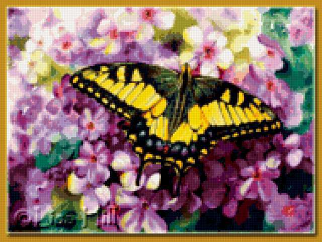 Ориентировочно так, схема вышивки «Butterfly», созданная автором aniela, будет выглядеть при отшиве на канве. Размер данной вышивки равен 190x143 крестов, при этом используется 77 цветов. Ключевые слова, по которым можно найти эту схему: wildlife, butterfly, бабочка, flowers. Также, вы можете взглянуть на оригинальную картинку, соответствующую данной схеме вышивки.