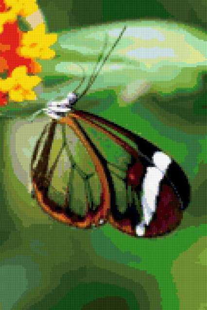 Ориентировочно так, схема вышивки «Butterfly», созданная автором Cherry_LudOk, будет выглядеть при отшиве на канве. Размер данной вышивки равен 120x180 крестов, при этом используется 65 цветов. Ключевые слова, по которым можно найти эту схему: бабочка, насекомые. Также, вы можете взглянуть на оригинальную картинку, соответствующую данной схеме вышивки.