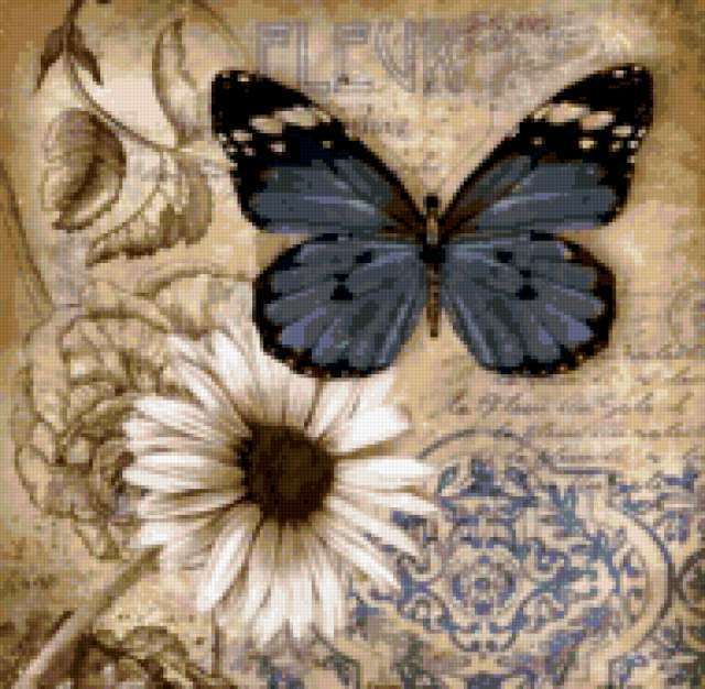 Ориентировочно так, схема вышивки «Butterfly», созданная автором aniela, будет выглядеть при отшиве на канве. Размер данной вышивки равен 190x186 крестов, при этом используется 68 цветов. Ключевые слова, по которым можно найти эту схему: wildlife, butterfly, бабочка, flowers. Также, вы можете взглянуть на оригинальную картинку, соответствующую данной схеме вышивки.