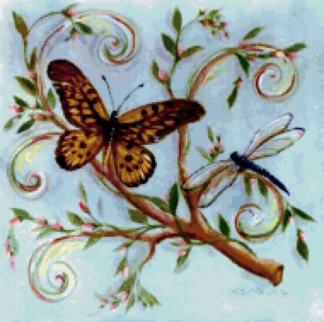 Ориентировочно так, схема вышивки «Butterfly», созданная автором aniela, будет выглядеть при отшиве на канве. Размер данной вышивки равен 190x189 крестов, при этом используется 72 цветов. Ключевые слова, по которым можно найти эту схему: wildlife, butterfly, бабочка, flowers. Также, вы можете взглянуть на оригинальную картинку, соответствующую данной схеме вышивки.