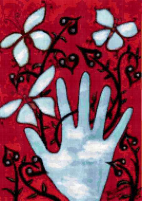 Ориентировочно так, схема вышивки «Butterfly», созданная автором aniela, будет выглядеть при отшиве на канве. Размер данной вышивки равен 135x190 крестов, при этом используется 50 цветов. Ключевые слова, по которым можно найти эту схему: wildlife, butterfly, бабочка. Также, вы можете взглянуть на оригинальную картинку, соответствующую данной схеме вышивки.