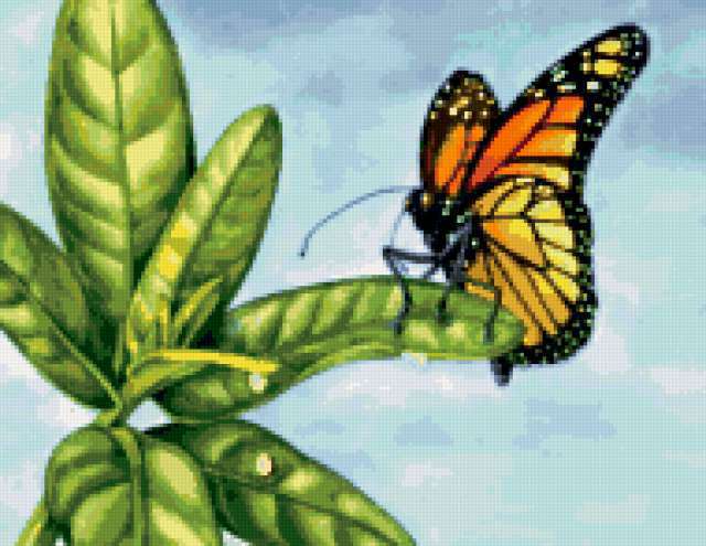 Ориентировочно так, схема вышивки «Butterfly», созданная автором aniela, будет выглядеть при отшиве на канве. Размер данной вышивки равен 190x147 крестов, при этом используется 55 цветов. Ключевые слова, по которым можно найти эту схему: wildlife, butterfly, бабочка. Также, вы можете взглянуть на оригинальную картинку, соответствующую данной схеме вышивки.