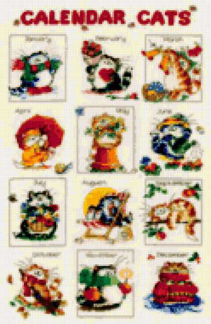 Ориентировочно так, схема вышивки «Calendar Cats», созданная автором xamka, будет выглядеть при отшиве на канве. Размер данной вышивки равен 124x190 крестов, при этом используется 63 цветов. К несчастью, автор не назначил для схемы ключевые слова. Также, вы можете взглянуть на оригинальную картинку, соответствующую данной схеме вышивки.