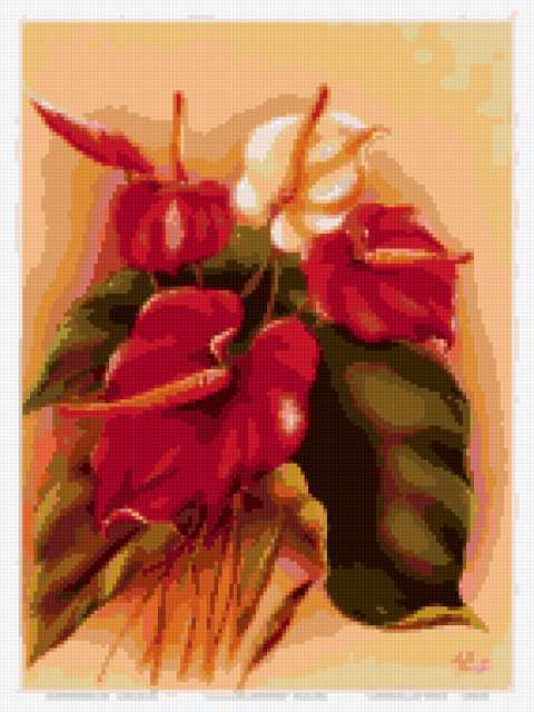Ориентировочно так, схема вышивки «Calla», созданная автором lukrecija12, будет выглядеть при отшиве на канве. Размер данной вышивки равен 142x189 крестов, при этом используется 35 цветов. Ключевые слова, по которым можно найти эту схему: flower. Также, вы можете взглянуть на оригинальную картинку, соответствующую данной схеме вышивки.