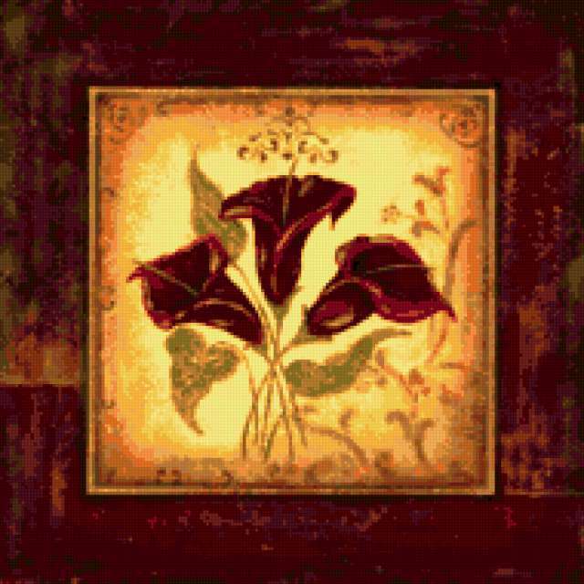 Ориентировочно так, схема вышивки «Calla», созданная автором lukrecija12, будет выглядеть при отшиве на канве. Размер данной вышивки равен 190x190 крестов, при этом используется 30 цветов. Ключевые слова, по которым можно найти эту схему: flower. Также, вы можете взглянуть на оригинальную картинку, соответствующую данной схеме вышивки.