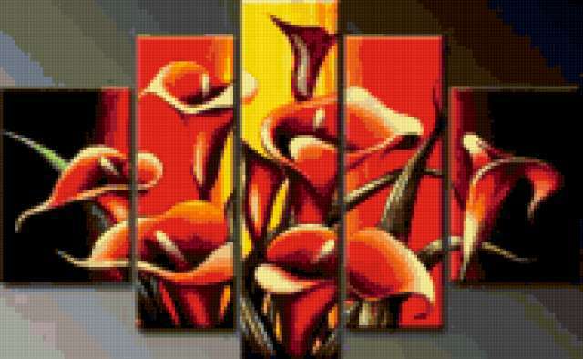Ориентировочно так, схема вышивки «Callas Collage», созданная автором pandreevska, будет выглядеть при отшиве на канве. Размер данной вышивки равен 190x117 крестов, при этом используется 64 цветов. Ключевые слова, по которым можно найти эту схему: цветы, рисунок, картина, декорация, collage. Также, вы можете взглянуть на оригинальную картинку, соответствующую данной схеме вышивки.
