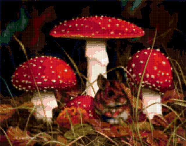 Ориентировочно так, схема вышивки «Carl Whitfield», созданная автором malkinaiv, будет выглядеть при отшиве на канве. Размер данной вышивки равен 190x149 крестов, при этом используется 40 цветов. Ключевые слова, по которым можно найти эту схему: искусство, живопись, картина, грибы, мухоморы, мыши, природа. Также, вы можете взглянуть на оригинальную картинку, соответствующую данной схеме вышивки.