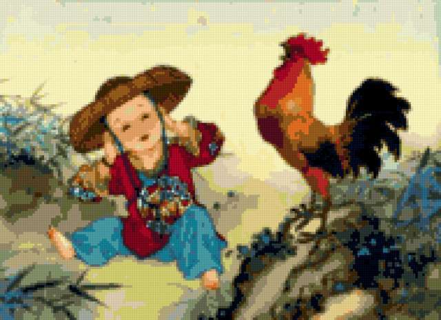 Ориентировочно так, схема вышивки «Caroline Young», созданная автором avevstigneeva, будет выглядеть при отшиве на канве. Размер данной вышивки равен 190x138 крестов, при этом используется 45 цветов. Ключевые слова, по которым можно найти эту схему: живопись, китайская, восточные мотивы, дети, юмор, петух. Также, вы можете взглянуть на оригинальную картинку, соответствующую данной схеме вышивки.