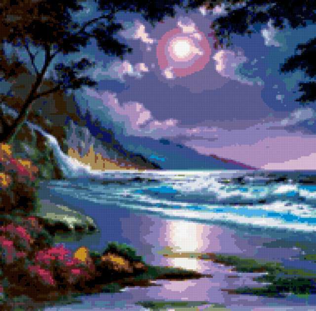 Ориентировочно так, схема вышивки «Casay Аnthony», созданная автором malkinaiv, будет выглядеть при отшиве на канве. Размер данной вышивки равен 190x187 крестов, при этом используется 57 цветов. Ключевые слова, по которым можно найти эту схему: пейзаж, картина, берег, море, волны, прибой. Также, вы можете взглянуть на оригинальную картинку, соответствующую данной схеме вышивки.