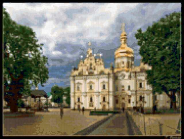Ориентировочно так, схема вышивки «Castle», созданная автором Cherry_LudOk, будет выглядеть при отшиве на канве. Размер данной вышивки равен 180x136 крестов, при этом используется 60 цветов. Ключевые слова, по которым можно найти эту схему: замок, пейзаж. Также, вы можете взглянуть на оригинальную картинку, соответствующую данной схеме вышивки.