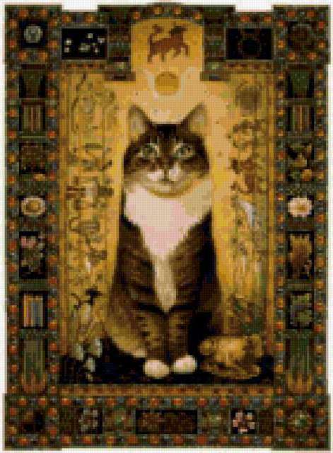 Ориентировочно так, схема вышивки «Cat», созданная автором aniela, будет выглядеть при отшиве на канве. Размер данной вышивки равен 140x190 крестов, при этом используется 67 цветов. Ключевые слова, по которым можно найти эту схему: животные, pets, animals, кошка. Также, вы можете взглянуть на оригинальную картинку, соответствующую данной схеме вышивки.