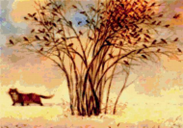 Ориентировочно так, схема вышивки «Cat», созданная автором aniela, будет выглядеть при отшиве на канве. Размер данной вышивки равен 190x133 крестов, при этом используется 68 цветов. Ключевые слова, по которым можно найти эту схему: животные, pets, animals, кошка. Также, вы можете взглянуть на оригинальную картинку, соответствующую данной схеме вышивки.