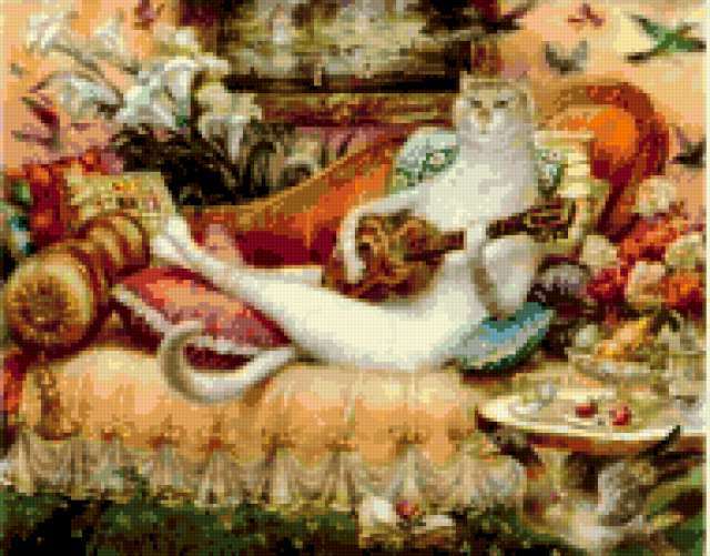 Ориентировочно так, схема вышивки «Cat», созданная автором aniela, будет выглядеть при отшиве на канве. Размер данной вышивки равен 190x149 крестов, при этом используется 84 цветов. Ключевые слова, по которым можно найти эту схему: животные, pets, animals, кошка. Также, вы можете взглянуть на оригинальную картинку, соответствующую данной схеме вышивки.