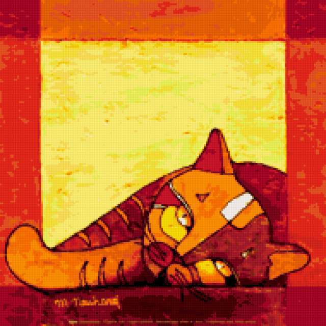 Ориентировочно так, схема вышивки «Cats», созданная автором lv-sunflower, будет выглядеть при отшиве на канве. Размер данной вышивки равен 190x190 крестов, при этом используется 39 цветов. Ключевые слова, по которым можно найти эту схему: кот, животные, графика. Также, вы можете взглянуть на оригинальную картинку, соответствующую данной схеме вышивки.