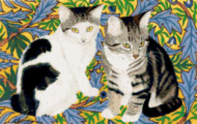 Ориентировочно так, схема вышивки «Cats», созданная автором pandreevska, будет выглядеть при отшиве на канве. Размер данной вышивки равен 190x120 крестов, при этом используется 68 цветов. Ключевые слова, по которым можно найти эту схему: animals, животные, flowers, кошка, cat . Также, вы можете взглянуть на оригинальную картинку, соответствующую данной схеме вышивки.