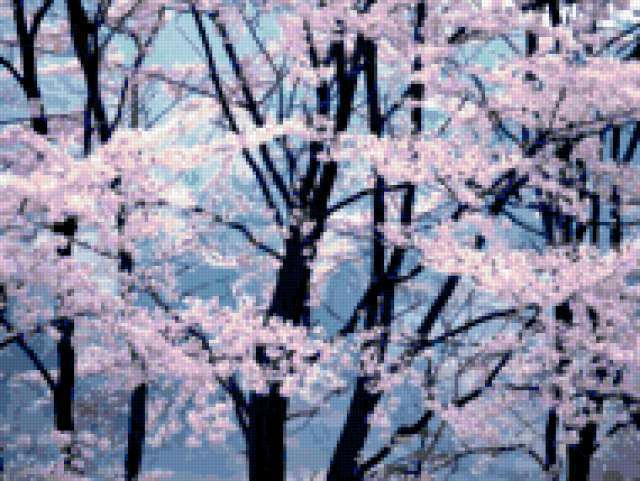 Ориентировочно так, схема вышивки «Cherry blossoms», созданная автором aniela, будет выглядеть при отшиве на канве. Размер данной вышивки равен 190x143 крестов, при этом используется 60 цветов. Ключевые слова, по которым можно найти эту схему: пейзаж, landscape, tree. Также, вы можете взглянуть на оригинальную картинку, соответствующую данной схеме вышивки.