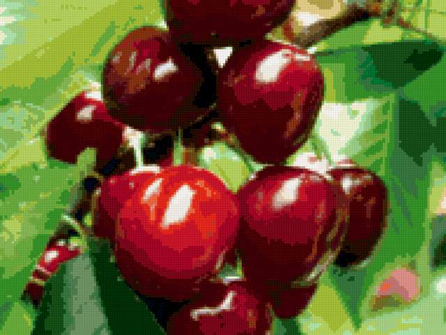 Ориентировочно так, схема вышивки «Cherry», созданная автором -curly-, будет выглядеть при отшиве на канве. Размер данной вышивки равен 190x143 крестов, при этом используется 57 цветов. Ключевые слова, по которым можно найти эту схему: ягоды. Также, вы можете взглянуть на оригинальную картинку, соответствующую данной схеме вышивки.