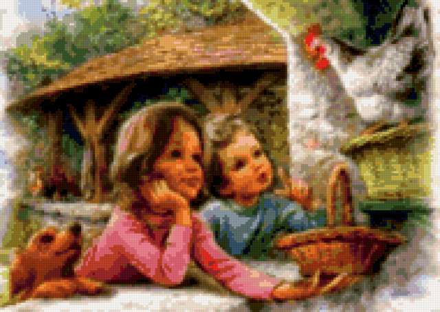 Ориентировочно так, схема вышивки «Children», созданная автором aniela, будет выглядеть при отшиве на канве. Размер данной вышивки равен 190x135 крестов, при этом используется 88 цветов. Ключевые слова, по которым можно найти эту схему: children, дети. Также, вы можете взглянуть на оригинальную картинку, соответствующую данной схеме вышивки.