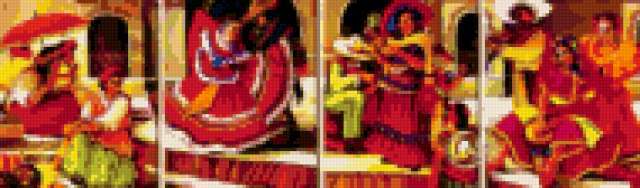 Ориентировочно так, схема вышивки «Cinco de Mayo Canvas», созданная автором me4o, будет выглядеть при отшиве на канве. Размер данной вышивки равен 190x56 крестов, при этом используется 55 цветов. Ключевые слова, по которым можно найти эту схему: cinco de mayo, canvas, celebration, holiday, latin america, music. Также, вы можете взглянуть на оригинальную картинку, соответствующую данной схеме вышивки.