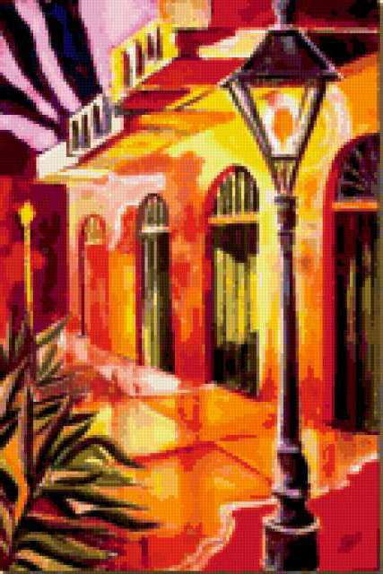 Ориентировочно так, схема вышивки «Cityscape», созданная автором aniela, будет выглядеть при отшиве на канве. Размер данной вышивки равен 127x190 крестов, при этом используется 75 цветов. Ключевые слова, по которым можно найти эту схему: пейзаж, архитэктура, cityscape, город. Также, вы можете взглянуть на оригинальную картинку, соответствующую данной схеме вышивки.