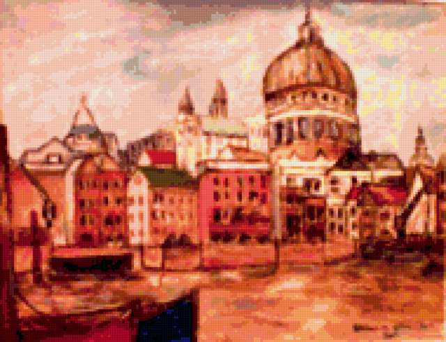 Ориентировочно так, схема вышивки «Cityscape», созданная автором aniela, будет выглядеть при отшиве на канве. Размер данной вышивки равен 190x146 крестов, при этом используется 63 цветов. Ключевые слова, по которым можно найти эту схему: пейзаж, архитэктура, cityscape, город. Также, вы можете взглянуть на оригинальную картинку, соответствующую данной схеме вышивки.