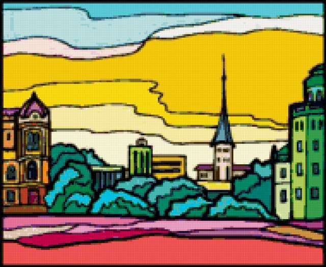 Ориентировочно так, схема вышивки «Cityscape», созданная автором aniela, будет выглядеть при отшиве на канве. Размер данной вышивки равен 190x156 крестов, при этом используется 70 цветов. Ключевые слова, по которым можно найти эту схему: пейзаж, архитэктура, cityscape, город. Также, вы можете взглянуть на оригинальную картинку, соответствующую данной схеме вышивки.