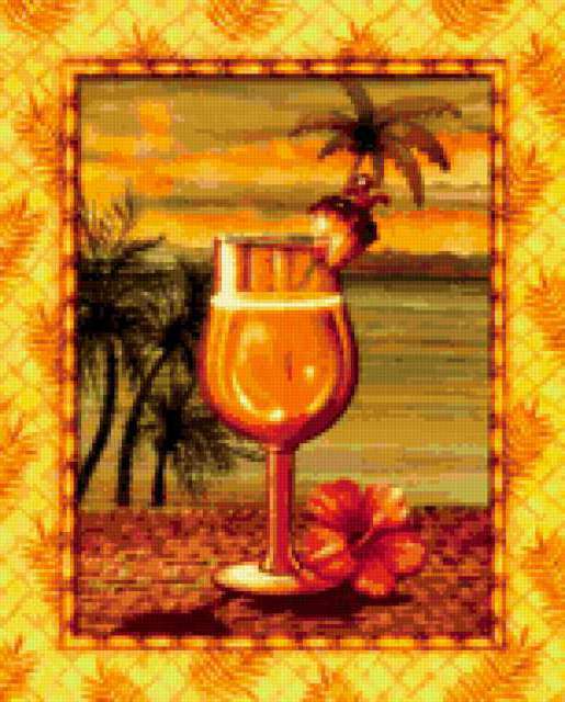 Ориентировочно так, схема вышивки «Cocktail Time», созданная автором pandreevska, будет выглядеть при отшиве на канве. Размер данной вышивки равен 153x190 крестов, при этом используется 60 цветов. Ключевые слова, по которым можно найти эту схему: still life, натюрморт, cocktail, tropical. Также, вы можете взглянуть на оригинальную картинку, соответствующую данной схеме вышивки.