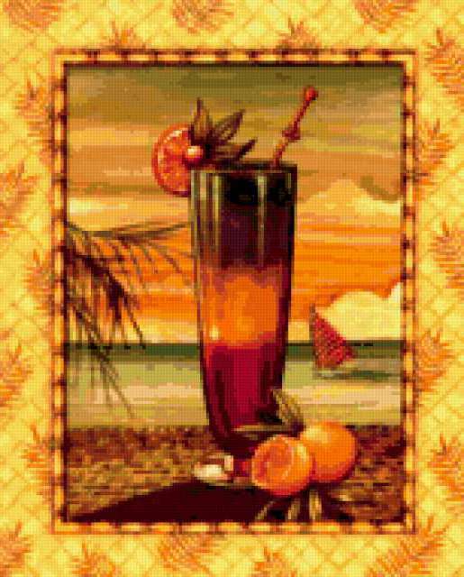 Ориентировочно так, схема вышивки «Cocktail Time», созданная автором pandreevska, будет выглядеть при отшиве на канве. Размер данной вышивки равен 153x190 крестов, при этом используется 57 цветов. Ключевые слова, по которым можно найти эту схему: still life, натюрморт, cocktail, tropical. Также, вы можете взглянуть на оригинальную картинку, соответствующую данной схеме вышивки.