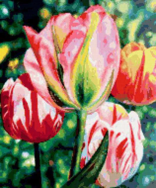Ориентировочно так, схема вышивки «Colorful Flowers - Tulips», созданная автором pandreevska, будет выглядеть при отшиве на канве. Размер данной вышивки равен 158x190 крестов, при этом используется 62 цветов. Ключевые слова, по которым можно найти эту схему: flower, stunning, colorful, decoration. Также, вы можете взглянуть на оригинальную картинку, соответствующую данной схеме вышивки.